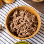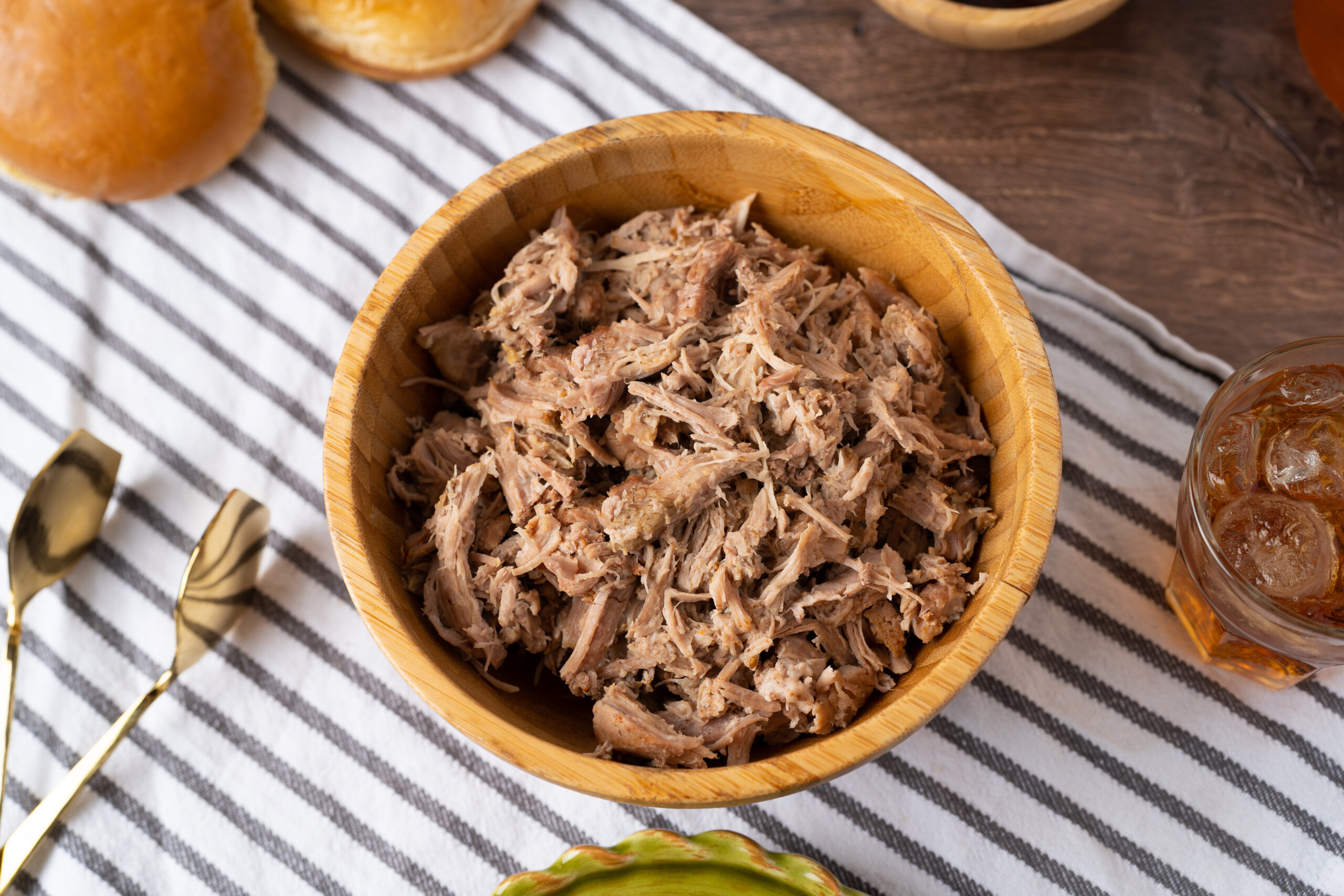 - Shred the pork shoulder pieces and reserve the juices in a separate container.